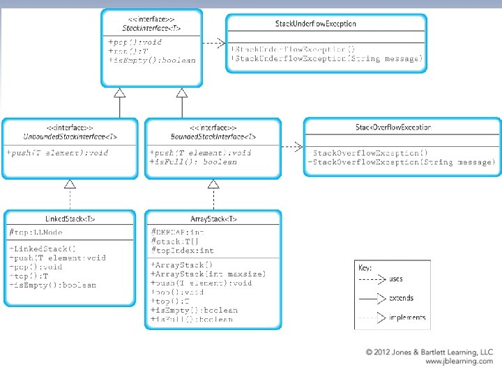 The Remaining Stack Interfaces The Bounded. Stack. Interface package ch 03. stacks; public interface Bounded. Stack. Interface<T> extends Stack. Interface<T> { public void push(T element) throws Stack. Overflow. Exception; // Throws Stack. Overflow. Exception if this stack is full, // otherwise places element at the top of this stack. public boolean is. Full(); // Returns true if this stack is full, otherwise returns false. } The Unbounded. Stack. Interface package ch 03. stacks; public interface Unbounded. Stack. Interface<T> extends Stack. Interface<T> { public void push(T element); // Places element at the top of this stack. }
