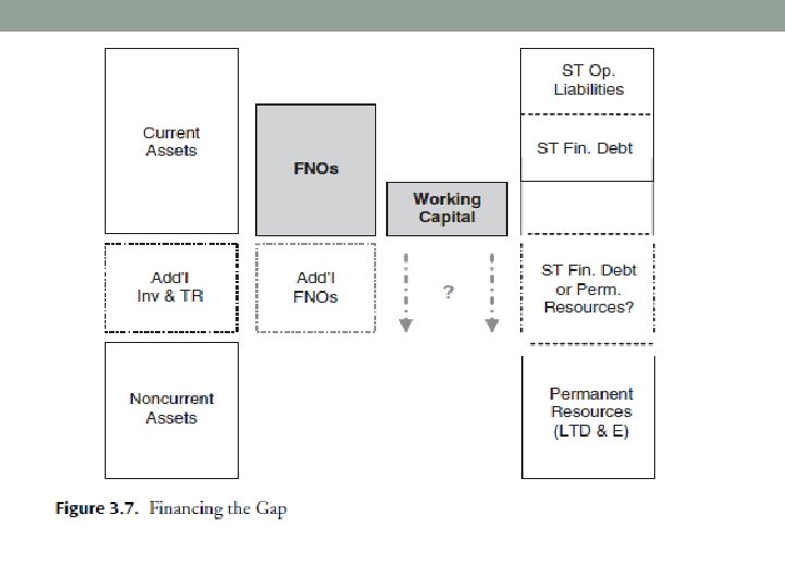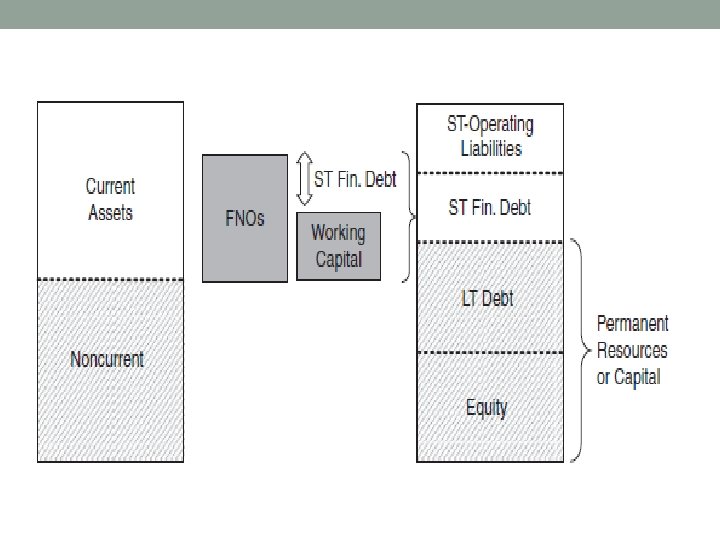 • Let’s go back to our basic concepts. Recall from Chapter 2 that FNOs are a short-term financing notion, whereas working capital is mostly connected to long-term finance. • This became obvious when we departed from the traditional accounting view of working capital (current assets minus current liabilities) and defined it as the difference between the permanent resources and the fixed (noncurrent) assets of the firm. We illustrate the connection between these concepts once more in Figure 1.