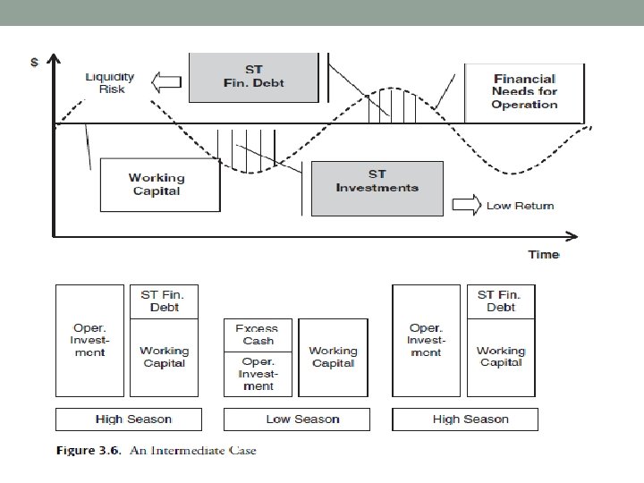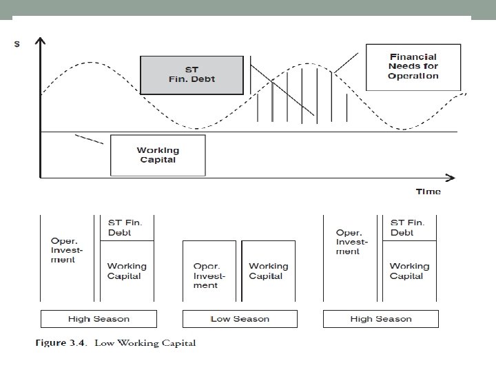 • The graph shows that during the high season, the firm will increase its operating investment and, since working capital does not change, the increased investment will be financed using short term financial debt. • During the low season, in contrast, the firm covers all its financial needs with working capital and has zero shortterm financing.