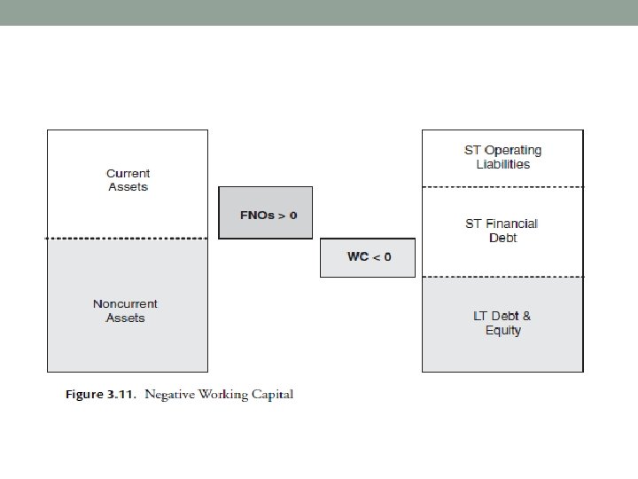• Note that in the previous scenario, a firm’s working capital will not always be equal to its FNOs (as it appears in Figure 3. 10 ). Indeed, this would be the case only if shortterm debt were equal to zero. In contrast, if there is at least some short-term debt, working capital will be larger (in absolute value) than the FNOs. • Shifting gears, we now consider a totally different scenario, namely, one in which a firm has positive FNOs (a positive financing gap) and negative working capital. 10 This scenario is depicted in Figure 3. 11.
