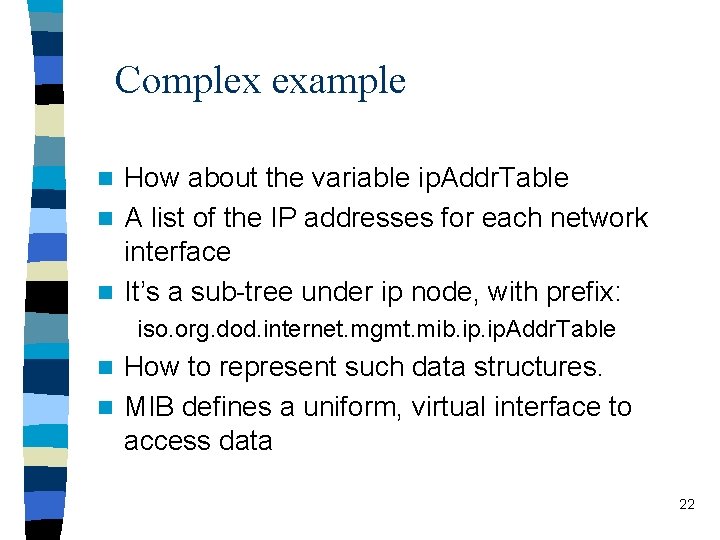Complex example How about the variable ip. Addr. Table n A list of the IP addresses for each network interface n It’s a sub-tree under ip node, with prefix: n iso. org. dod. internet. mgmt. mib. ip. Addr. Table How to represent such data structures. n MIB defines a uniform, virtual interface to access data n 22