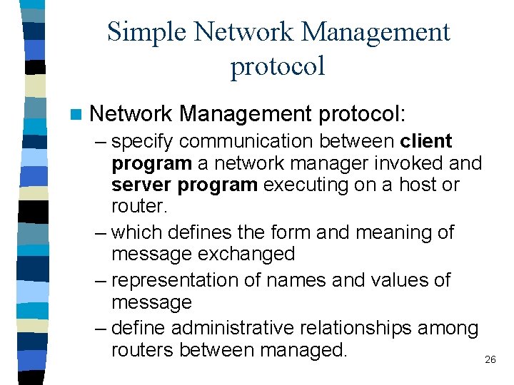 Simple Network Management protocol n Network Management protocol: – specify communication between client program a network manager invoked and server program executing on a host or router. – which defines the form and meaning of message exchanged – representation of names and values of message – define administrative relationships among routers between managed. 26