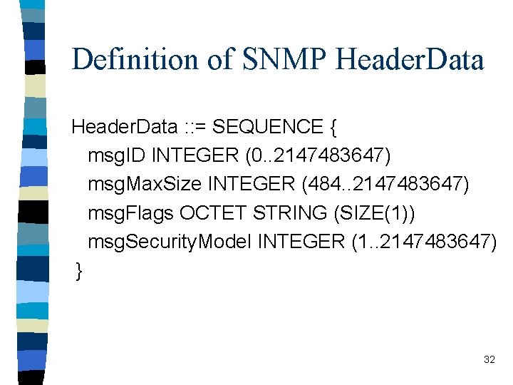 Definition of SNMP Header. Data : : = SEQUENCE { msg. ID INTEGER (0. . 2147483647) msg. Max. Size INTEGER (484. . 2147483647) msg. Flags OCTET STRING (SIZE(1)) msg. Security. Model INTEGER (1. . 2147483647) } 32