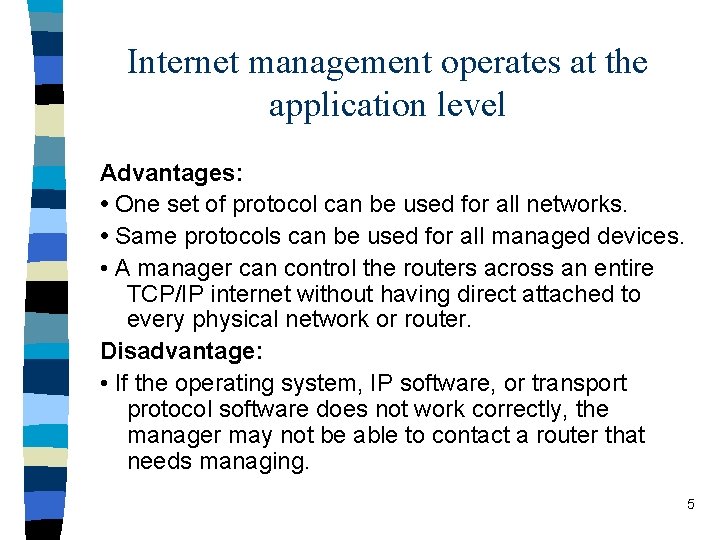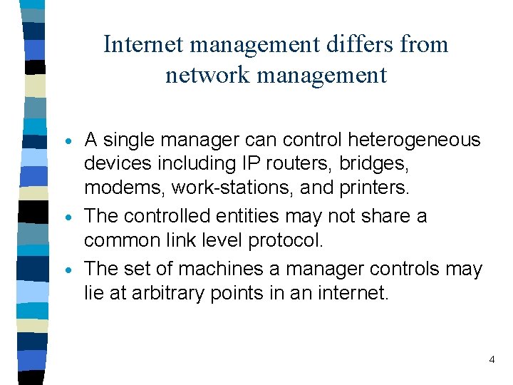 Internet management differs from network management A single manager can control heterogeneous devices including IP routers, bridges, modems, work-stations, and printers. · The controlled entities may not share a common link level protocol. · The set of machines a manager controls may lie at arbitrary points in an internet. · 4