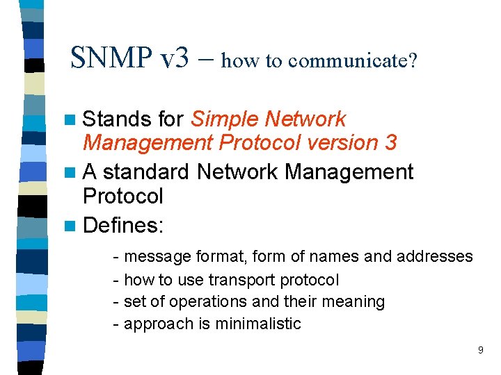 SNMP v 3 – how to communicate? n Stands for Simple Network Management Protocol version 3 n A standard Network Management Protocol n Defines: - message format, form of names and addresses - how to use transport protocol - set of operations and their meaning - approach is minimalistic 9