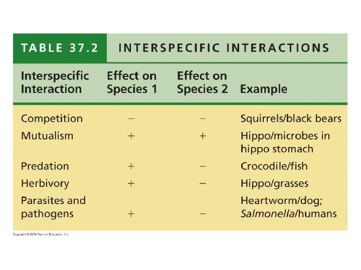 37. 2 Interspecific interactions are fundamental to community structure § Interspecific interactions – Relationships with other species in the community § Interspecific competition – Two different species compete for the same limited resource – Squirrels and black bears – Compete for acorns Copyright © 2009 Pearson Education, Inc.