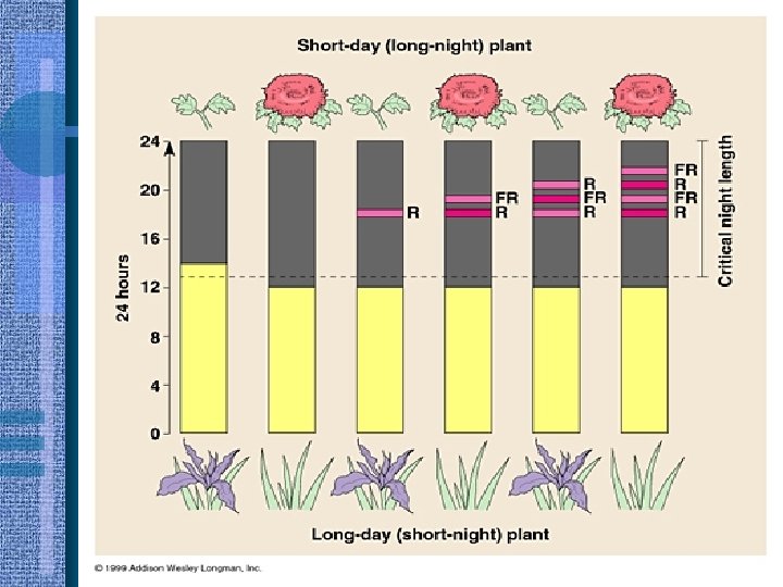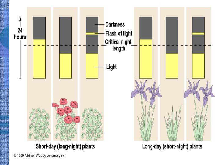 • SOME DEVELOPMENTAL PROCESSES, INCLUDING FLOWERING IN MANY PLANT SPECIES, REQUIRE A CERTAIN PHOTOPERIOD. • THE RELATIVE LENGTHS OF NIGHT AND DAY. – FOR EXAMPLE, A CRITICAL NIGHT LENGTH SETS A MINIMUM (IN SHORT-DAY PLANTS) OR MAXIMUM (IN LONG-DAY PLANTS) NUMBER OF HOURS OF DARKNESS REQUIRED FOR FLOWERING.