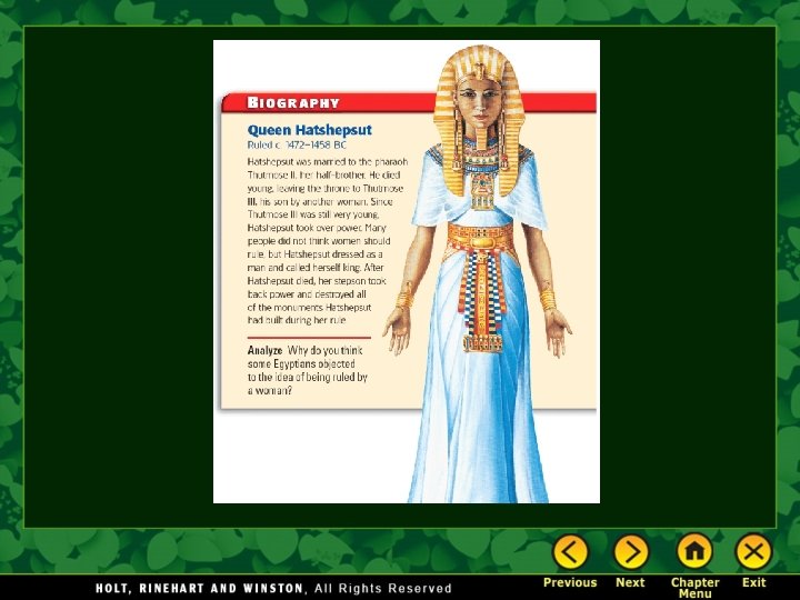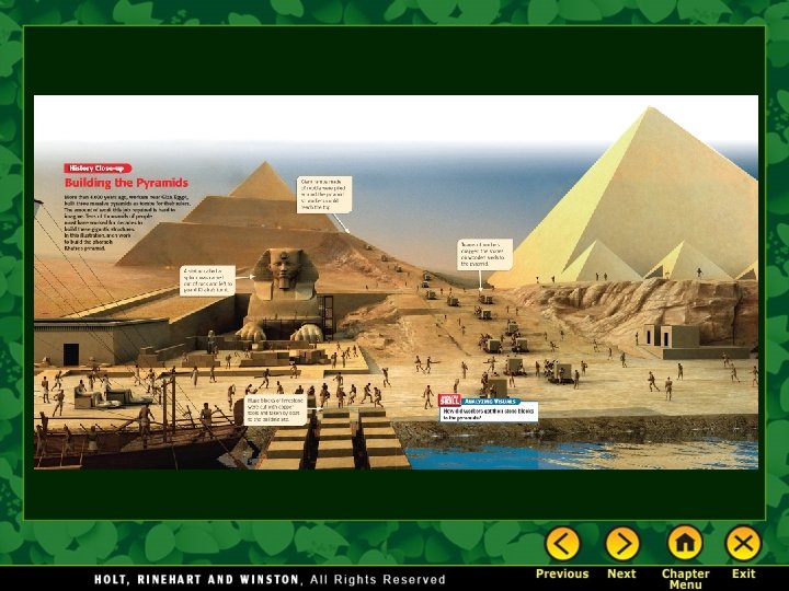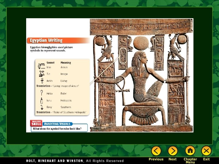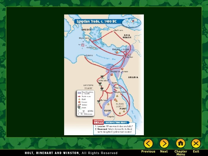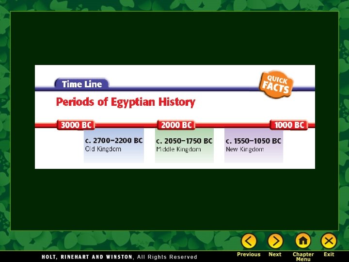 Chapter 4 – Ancient Egypt Section Notes Video Geography and Early Egypt The Old Kingdom The Middle and New Kingdoms Egyptian Achievements Ancient Egypt and Kush History Close-up Building the Pyramids The Temple of Karnak Quick Facts Periods of Egyptian History Chapter 4 Visual Summary Maps Ancient Egyptian Trade Images Menes Egyptian Society Queen Hatshepsut Egyptian Writing Treasures of King Tut’s Tomb