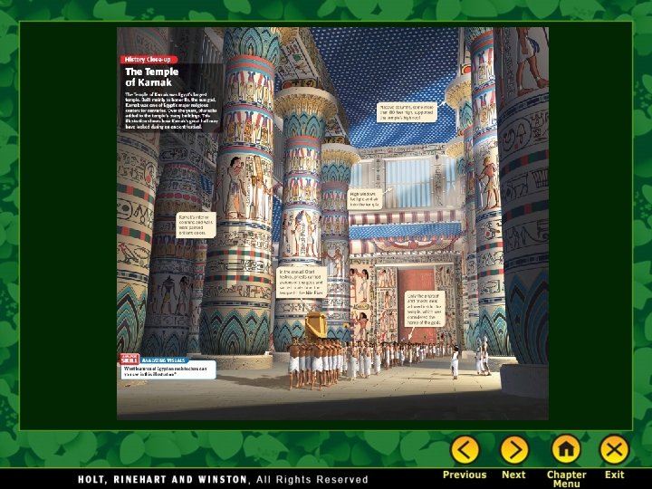 Main Idea 2: Egypt’s great temples were lavishly decorated. Egyptians believed the massive temples were homes of the gods. People visited to worship, offer gifts to the gods, and ask for favors. Temples had • Stone sphinxes and other statues • obelisk: tall, four-sided pillar that is pointed at the top • Painted walls and columns that also had hieroglyphics