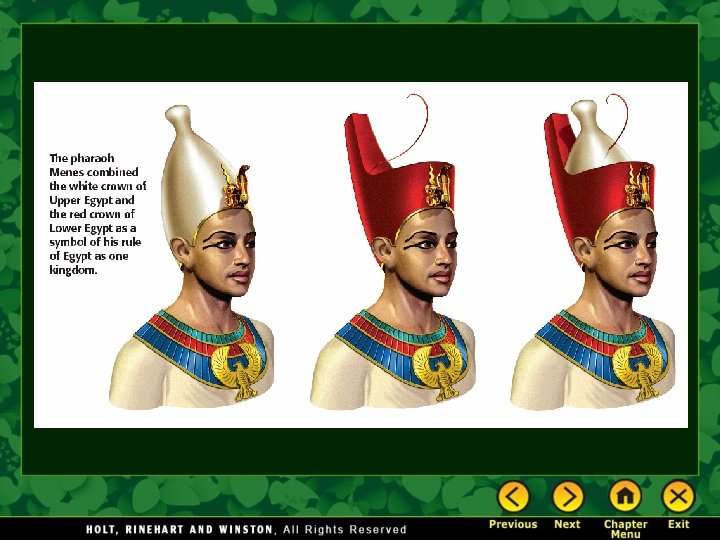 Main Idea 3: Strong kings unified all of Egypt. • According to tradition, Menes rose to power in Upper Egypt and unified the two kingdoms by taking control of Lower Egypt and marrying a Lower Egyptian princess. • Menes was probably Egypt’s first pharaoh, or ruler. • He also founded Egypt’s first dynasty, or series of rulers from the same family.