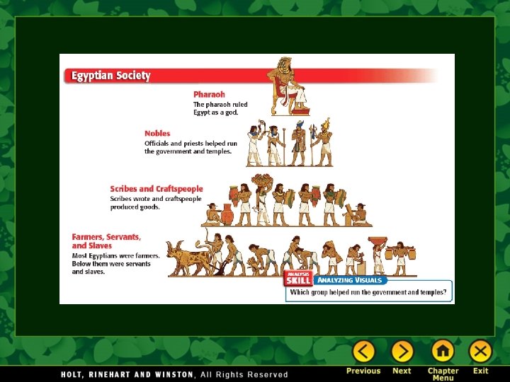 Egyptian Society • Social classes – Pharaohs ruled Egypt as gods. – Nobles were officials and priests who helped run the government. – Scribes and craftspeople wrote and produced goods. – Farmers, servants, and slaves made up most of Egyptian society.