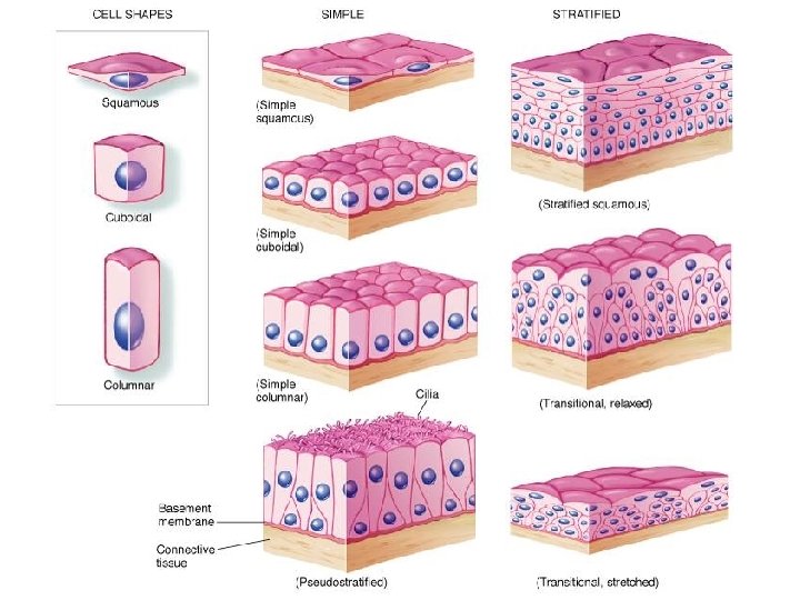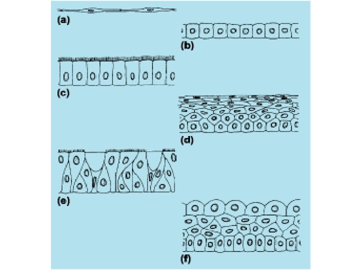 * classified according to shape of cells: squamous = flattened cells cuboidal = cube-shaped cells columnar = elongated (tall) cells