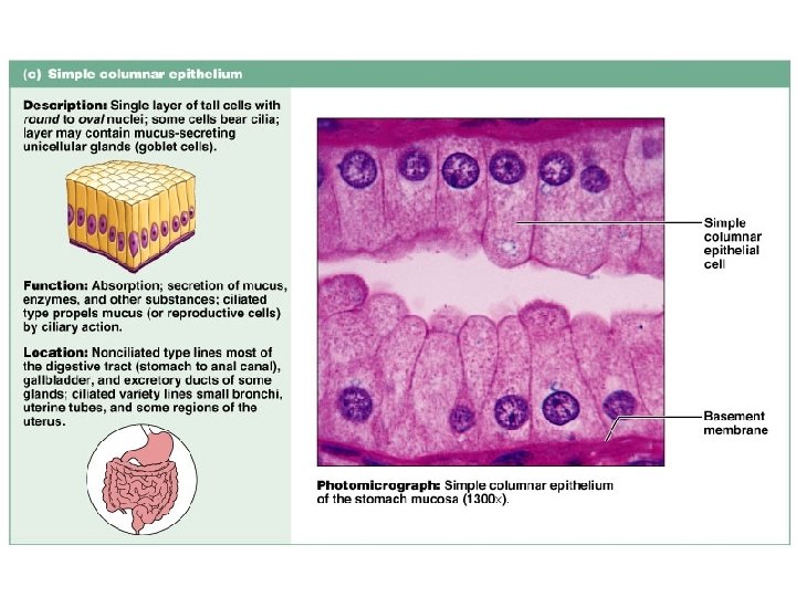 1. simple columnar epithelium * F – secretion (mucus), absorption * L – digestive tract, ducts of glands