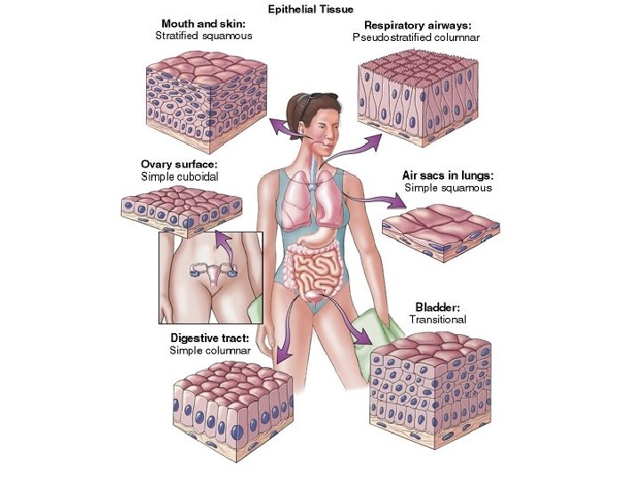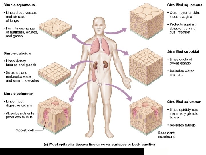 1. simple squamous epithelium * F – allows passage of materials * L – kidneys, lungs, blood vessels, heart