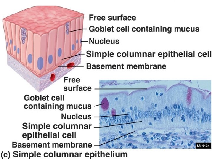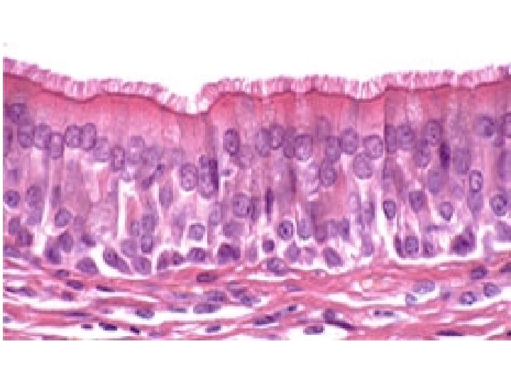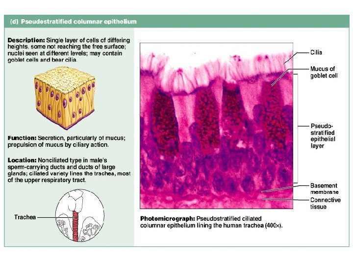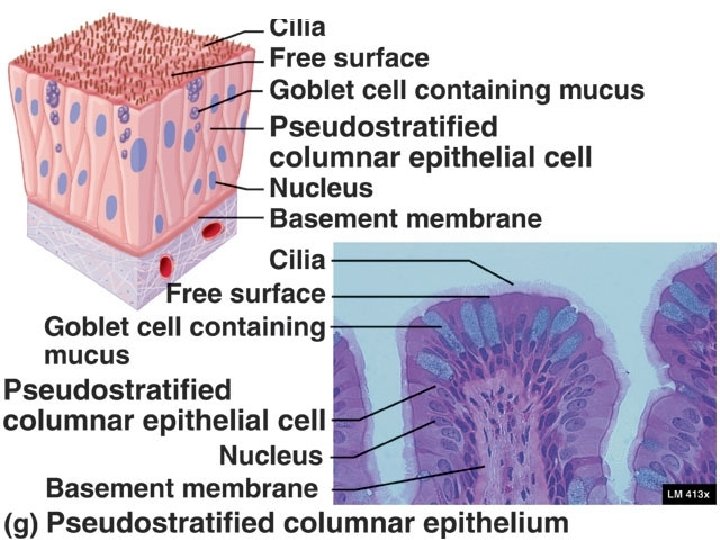 * may have cilia = pseudostratified ciliated columnar epithelium * F – protection, secretion * L – respiratory and reproductive tracts
