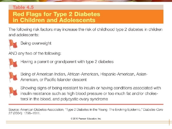 Quick Review Ø Symptoms of hypoglycemia • Hungry, nervous, light-headed, shaky, and/or sweaty Ø Diabetics who take medications and/or insulin and do not eat properly are at risk Ø Individuals without diabetes may experience reactive hypoglycemia several hours after meals Ø Fasting hypoglycemia may occur upon awaking in the morning Ø Can be caused by medications, illnesses, hormone imbalances, or excessive consumption of alcohol © 2010 Pearson Education, Inc.