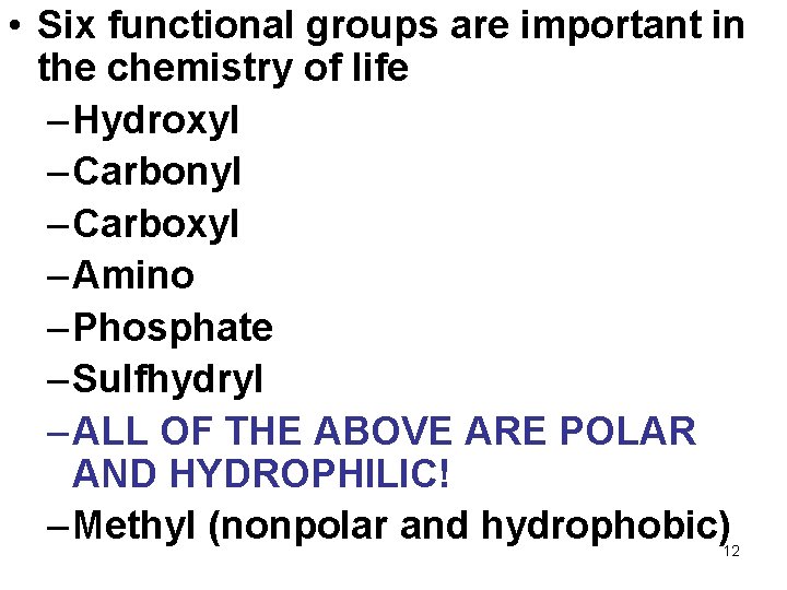 • Six functional groups are important in the chemistry of life – Hydroxyl – Carbonyl – Carboxyl – Amino – Phosphate – Sulfhydryl – ALL OF THE ABOVE ARE POLAR AND HYDROPHILIC! – Methyl (nonpolar and hydrophobic) 12