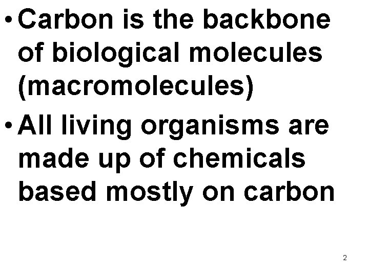 • Carbon is the backbone of biological molecules (macromolecules) • All living organisms are made up of chemicals based mostly on carbon 2