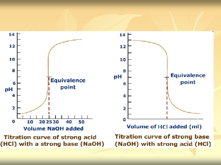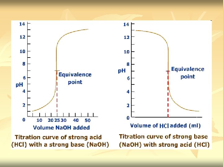 n n Before titration started – only have HCl. [H+]=[HX] Titration proceed – part of H+ is removed from solution as H 2 O. [H+] decrease gradually. p. H increase [H+]=[remaining HX] At equivalence point - we have solution of Na. Cl. Neutralization complete. HCl had been neutralize by Na. OH. [H+]= √Kw Excess Na. OH added – [OH-] increase. p. H is determine by concentration of OH[OH-]=[excess titrant]