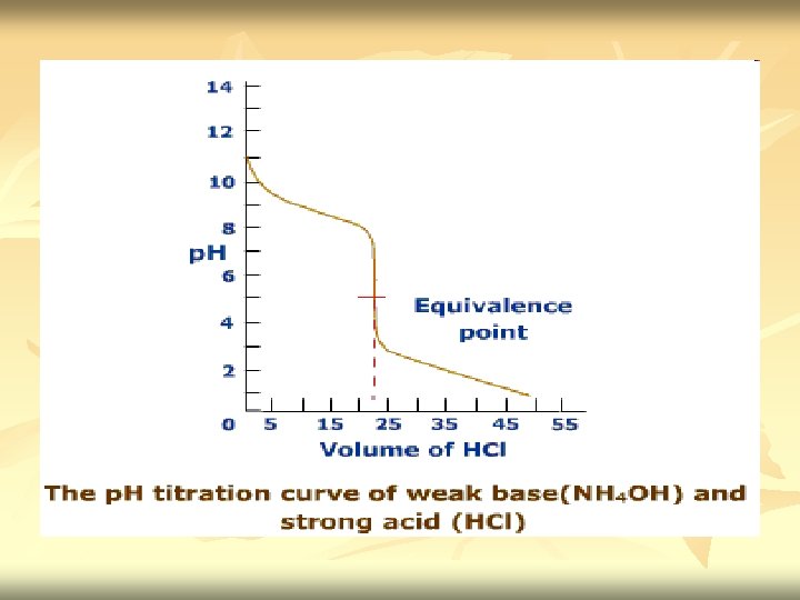 n n At equivalence point – we have solution of NH 4 Cl. Neutralization complete. NH 3 had been neutralize by HCl. [H+]=√Kw. CBH+ Kb Excess Na. OH added – p. H is determine by concentration of H+