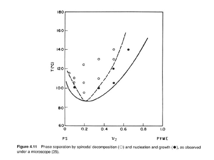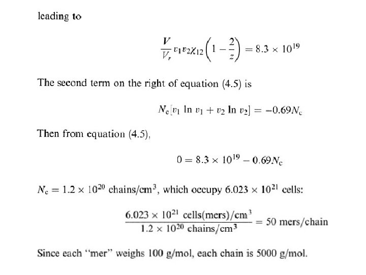 4. 1. 2 Polymer-Solvent Systems According to thermodynamic principles, the condition for equilibrium between two phases requires that the partial molar free energy of each component be equal in each phase. This condition requires that the first and second derivatives of △G 1 with respect to ν 2 be zero. The critical concentration at which phase separation occurs may be written For large n, the right-hand side of Eq (4. 1) reduces to 1/n 0. 5.