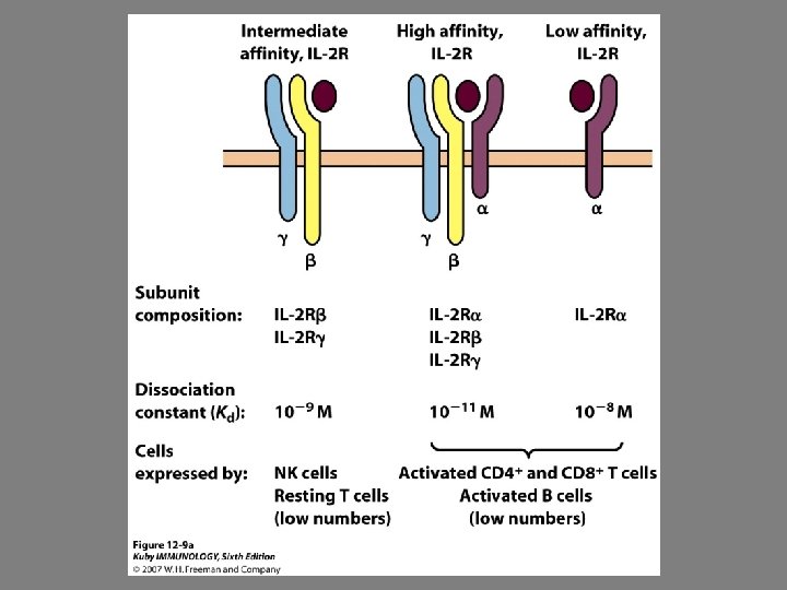 IL-2 R is the most thoroughly studied cytokine receptor Expressed by T cells for proliferation ○ Also called CD 25, surface marker in mature T cells Complete receptor has 3 subunits – subunits together have higher affinity for IL-2 (see next slide)