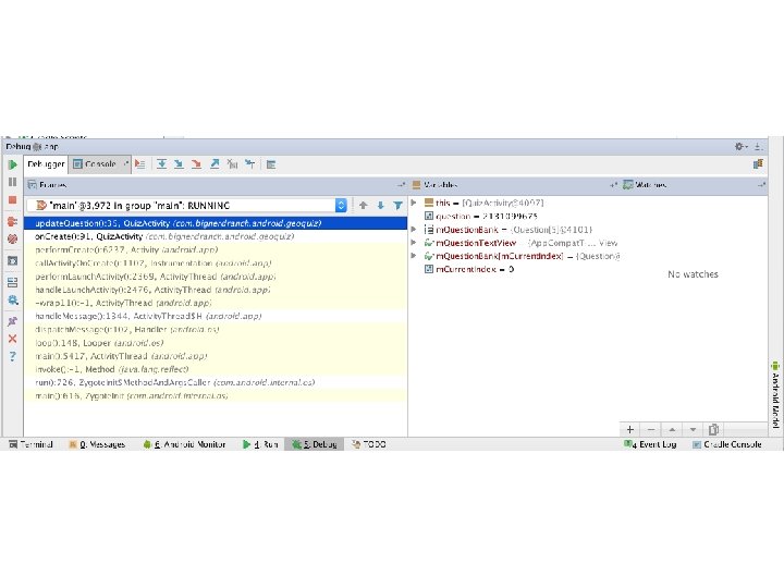 Logging Stack Traces • You can add Log. d(string, Throwable) to your code to generate a stack trace that will show up in Log. Cat. • You can use this method to find tricky bugs that don’t crash app but don’t execute properly. • Disable index increment (see Android Studio and next slide) public void on. Click(View v) { m. Current. Index = (m. Current. Index + 1) % m. Question. Store. length; update. Question(); } • And in update. Question() add: Log. d(TAG, "Updating question text for question #" + m. Current. Index, new Exception());