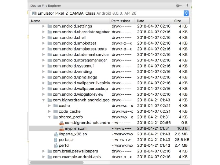 Shared Prefs • Shared. Preferences are stored in an xml file in the app data folder, i. e • /data/YOUR_PACKAGE_NAME/shared_p refs/YOUR_PREFS_NAME. xml