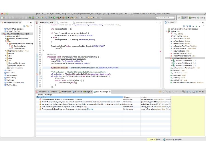 Android Lint • Static analyzer for Android • Catches errors in your code that Android Studio and Java wouldn’t • Make this change in your code: m. True. Button = (Button)find. View. By. Id(R. id. true_button); m. True. Button = (Button)find. View. By. Id(R. id. question_text_view); • Click Analyze->Inspect Code • Lint: check for common errors
