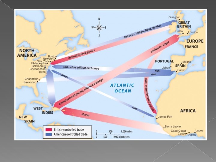 The Atlantic Slave Trade � Triangle Trade linked Europe, Africa and the Americas › “outward passage” – Africans exchanged war captives for manufactured goods (guns, jewelry, cloth, rum) › “middle passage” – horrific transport of slaves across the Atlantic, to the Caribbean › “return passage” – raw materials (sugar, tobacco, rice, cotton) from plantations in the Caribbean to Europe