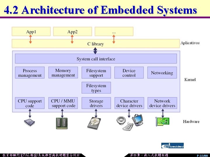 4. 2 Embedded Operating System 4. 1 Bootloader 4. 2 Embedded Operating System 4. 3 Root Filesystem 4. 4 Graphic User Interface of Embedded system 教育部顧問室PAL聯盟/系統雛型與軟硬體整合設計 第四章:嵌入式軟體架構 P-31/80