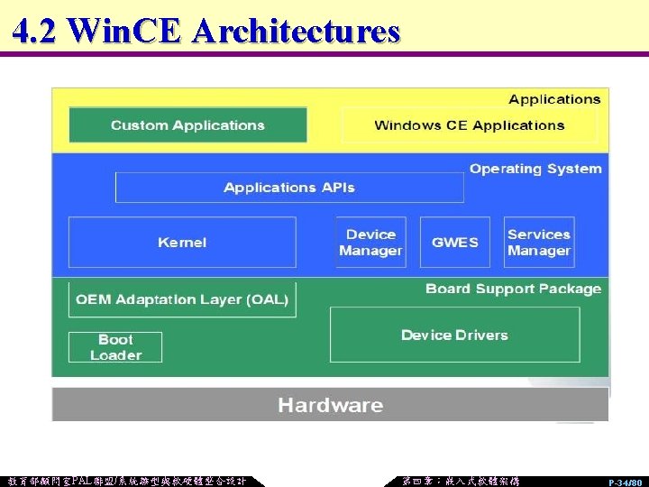4. 2 Typical Embedded Operating Systems Windows CE /Mobile Windows Palm OS EPOC u. C/OS-II Symbian OS RTOS: n Vx. Works, p. SOS… u Linux: n u. Clinux, Montavista Linux, ARM-Linux… u u u 教育部顧問室PAL聯盟/系統雛型與軟硬體整合設計 第四章:嵌入式軟體架構 P-33/80