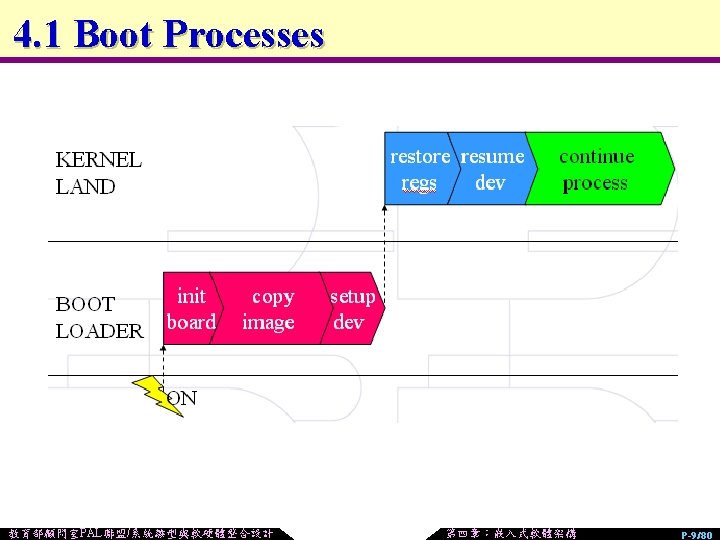 4. 1 Mission of Two-stage Bootloaders u Stage 1: n Hardware Initializing & Load Preparing l During Power up or System Reset n Assembly language u Stage 2: n Load Kernel Image n Launch Kernel Boot 教育部顧問室PAL聯盟/系統雛型與軟硬體整合設計 第四章:嵌入式軟體架構 P-12/80