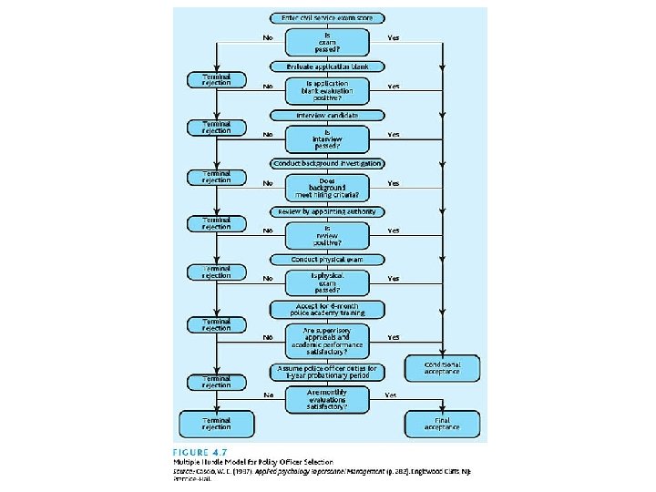 Employee Selection and Placement ¢ Statistical models of decision-making include: The multiple regression model, an approach that allows predictors to be combined statistically. l The multiple cutoff strategy, a method of setting minimum cutoff scores for each predictor. l The multiple hurdle approach, a stringent method that uses an ordered sequence of screening devices. l