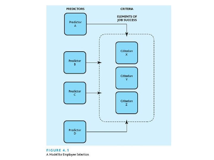 A Model for Employee Selection ¢ Criteria are measures of job success typically related to performance; for example, a criteria for successful basketball performance would be the number of baskets made. ¢ Predictors are variables about applicants that are related to the criteria; predictors for successful basketball performance could be experience and physical height.
