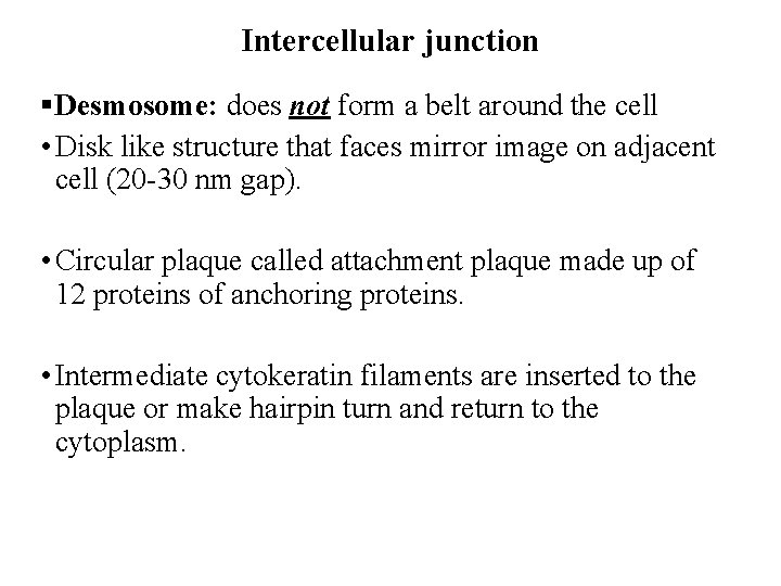 Intercellular junction §Desmosome: does not form a belt around the cell • Disk like structure that faces mirror image on adjacent cell (20 -30 nm gap). • Circular plaque called attachment plaque made up of 12 proteins of anchoring proteins. • Intermediate cytokeratin filaments are inserted to the plaque or make hairpin turn and return to the cytoplasm.