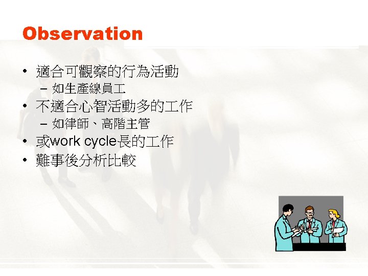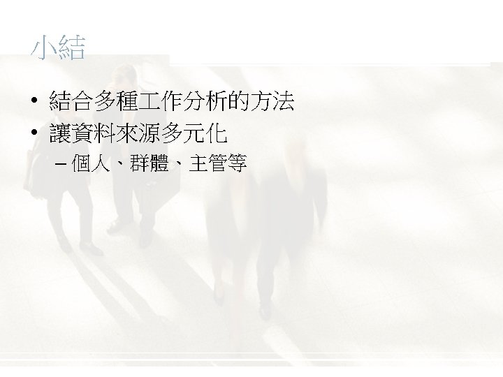 Types of Information Collected • Work activities 作活動 • Human behaviors • Machines, tools, equipment, and work aids • Performance standards • Job context 作內涵 • Human requirements