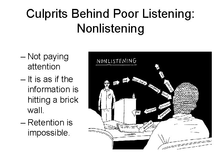 Culprits Behind Poor Listening: Nonlistening – Not paying attention – It is as if the information is hitting a brick wall. – Retention is impossible.