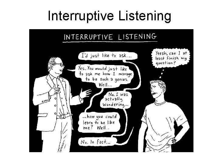 Culprits Behind Poor Listening: Interruptive Listening • When one person consistently interrupts another • Audiences can interrupt to derail a speaker. • Speakers can also interrupt audiences, cutting off a question or comment.