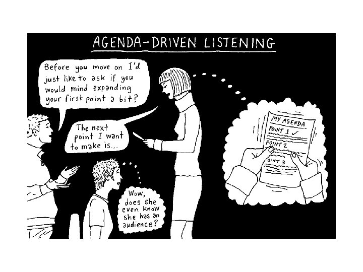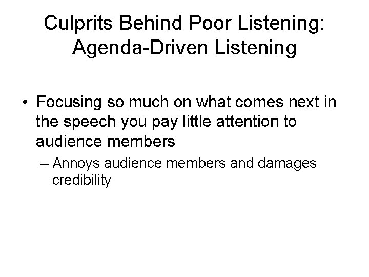 Culprits Behind Poor Listening: Agenda-Driven Listening • Focusing so much on what comes next in the speech you pay little attention to audience members – Annoys audience members and damages credibility