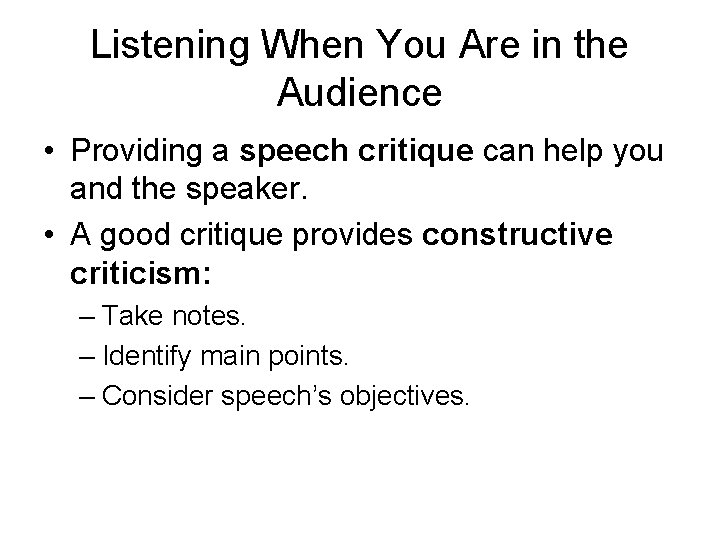 Listening When You Are in the Audience • Providing a speech critique can help you and the speaker. • A good critique provides constructive criticism: – Take notes. – Identify main points. – Consider speech’s objectives.