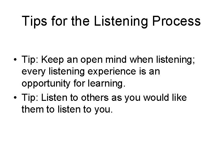 Tips for the Listening Process • Tip: Keep an open mind when listening; every listening experience is an opportunity for learning. • Tip: Listen to others as you would like them to listen to you.