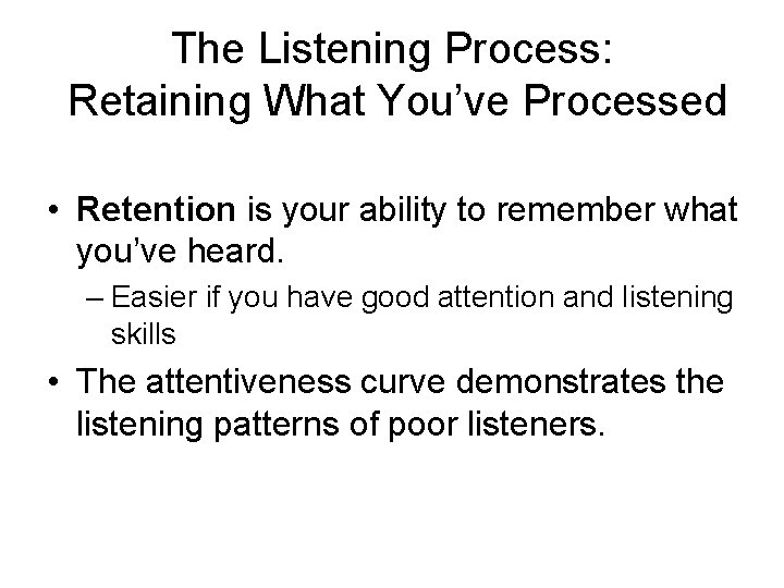 The Listening Process: Retaining What You’ve Processed • Retention is your ability to remember what you’ve heard. – Easier if you have good attention and listening skills • The attentiveness curve demonstrates the listening patterns of poor listeners.