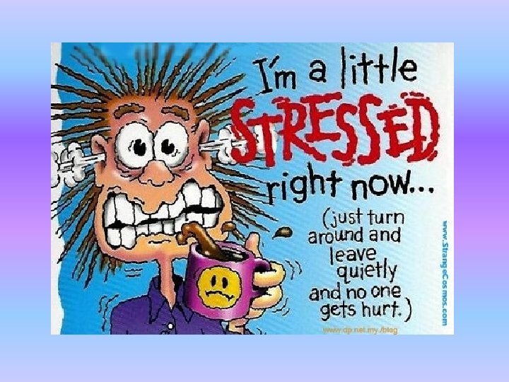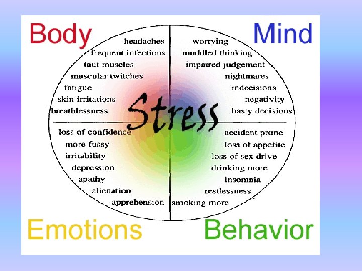 Physical effects of stress • • • Headache weakened immune system high blood pressure bruxism – clenching the jaw or grinding teeth digestive disorders