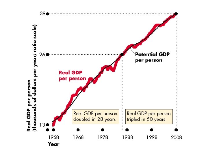 Uses of Real GDP • Use Real GDP per capita to – compare the standard of living over time – compare the standard of living across countries • In 1958, real GDP person was $12, 883 and in 2008, it was $38, 422 • Two sources of growth in standard of living – Growth of potential GDP per capita • Potential GDP = GDP if economy is at full employment – Fluctuations of real GDP around potential GDP