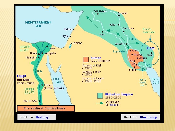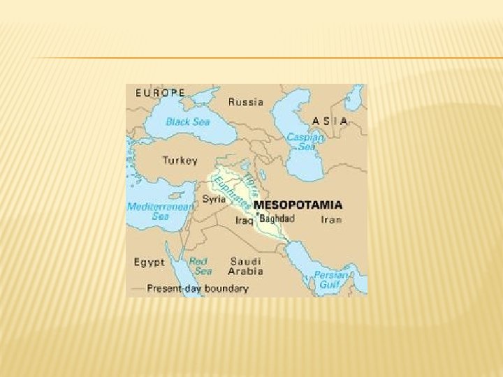 THE FIRST CIVILIZATIONS IN MESOPOTAMIA � � � Began in a plain located between the Tigris and Euphrates River Located in present-day Iraq. Lasted from 3000 B. C. to 500 B. C. Flooded rivers were filled with silt (fine particles of fertile soil) that made farming easy. Built dams to control seasonal floods and dug canals to let water flow to their fields. This is called irrigation (a system that supplies dry land with water through ditches, pipes, or streams. ) This let farmers grow surpluses (more than