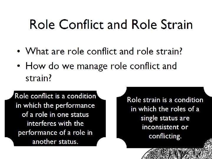 Role Conflict n n n Sometimes our roles conflict with each other A common example is the role conflict that many women experience In modern society women have to manage conflicting role of ‘traditional mother’ who stays at home and ‘working woman’ who maintains a career after becoming a mother