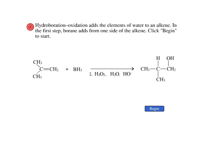 Anti-Markovnikov Addition Boron adds to least hindered carbon and is replaced w/ -OH by oxidation Formation of the most stable carbocation (A type of pericyclic reaction; important reaction and mechanism in directing reactions both regio- and stereoselectively. )
