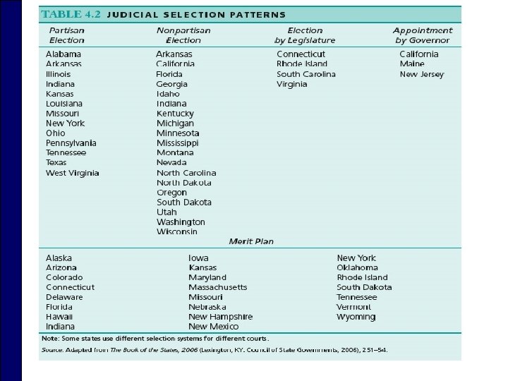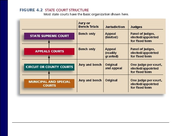 State Courts o Inclusion n The principle that state courts will apply federal laws when those laws directly conflict with the laws of the state o Specialized courts n Issues such as family disputes, traffic n Do not use juries o Appellate courts n Have panels of judges o Judicial elections n Missouri (Merit) Plan