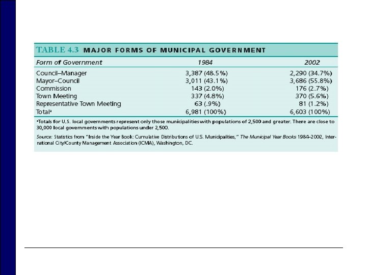 Executives and Legislatures o Between 1984 and 2002: n Trend away from council-manager form of city government toward the mayor-council form n Now half of U. S. cities have an elected mayor and council. n Slightly more than 1/3 of the municipalities have the Progressive model of government. o Professional manager and an elected city council o Most common among medium-sized cities n Some have both mayors and managers. n School districts follow the council-manager model. n Other special districts have boards. o Sometimes called public corporations or authorities